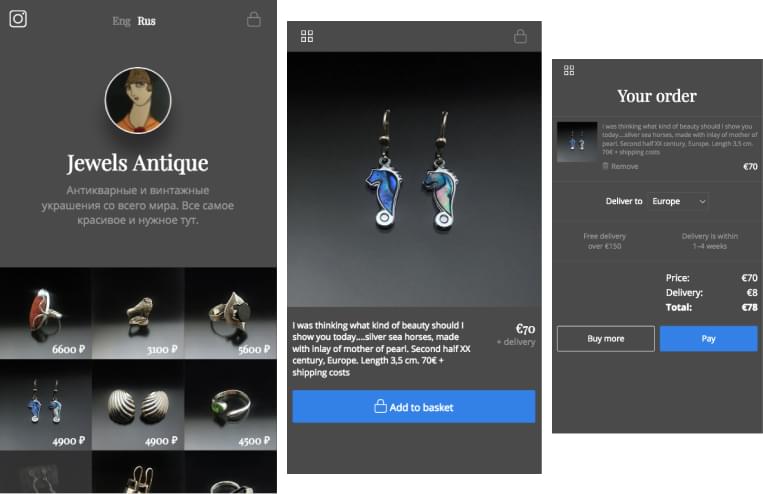 Jewels antique is an Instagram shop. We came up with a simple and elegant idea how to transform it into simple webshop. Everything that is posted to the Instagram account is automatically parsed and placed into a webshop. So there is no need for extra CMS system.