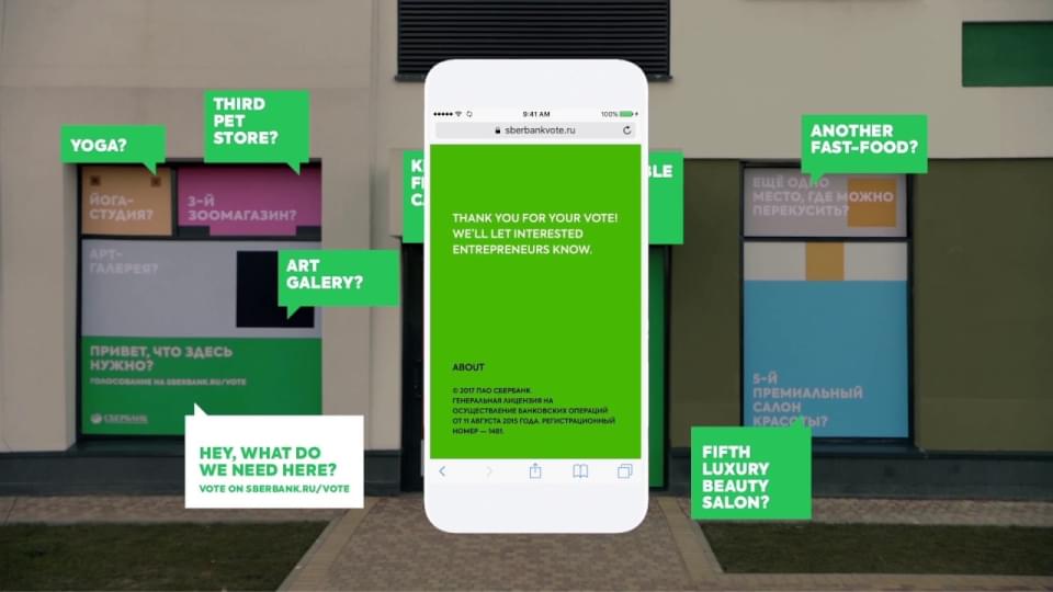 GOOD Moscow came up with a brilliant idea for Sberbank how to help local businesses to find a better location for their ventures. Campaign encourages people to vote what is missing in a certain physical location. We helped GOOD to build the voting webapp.
