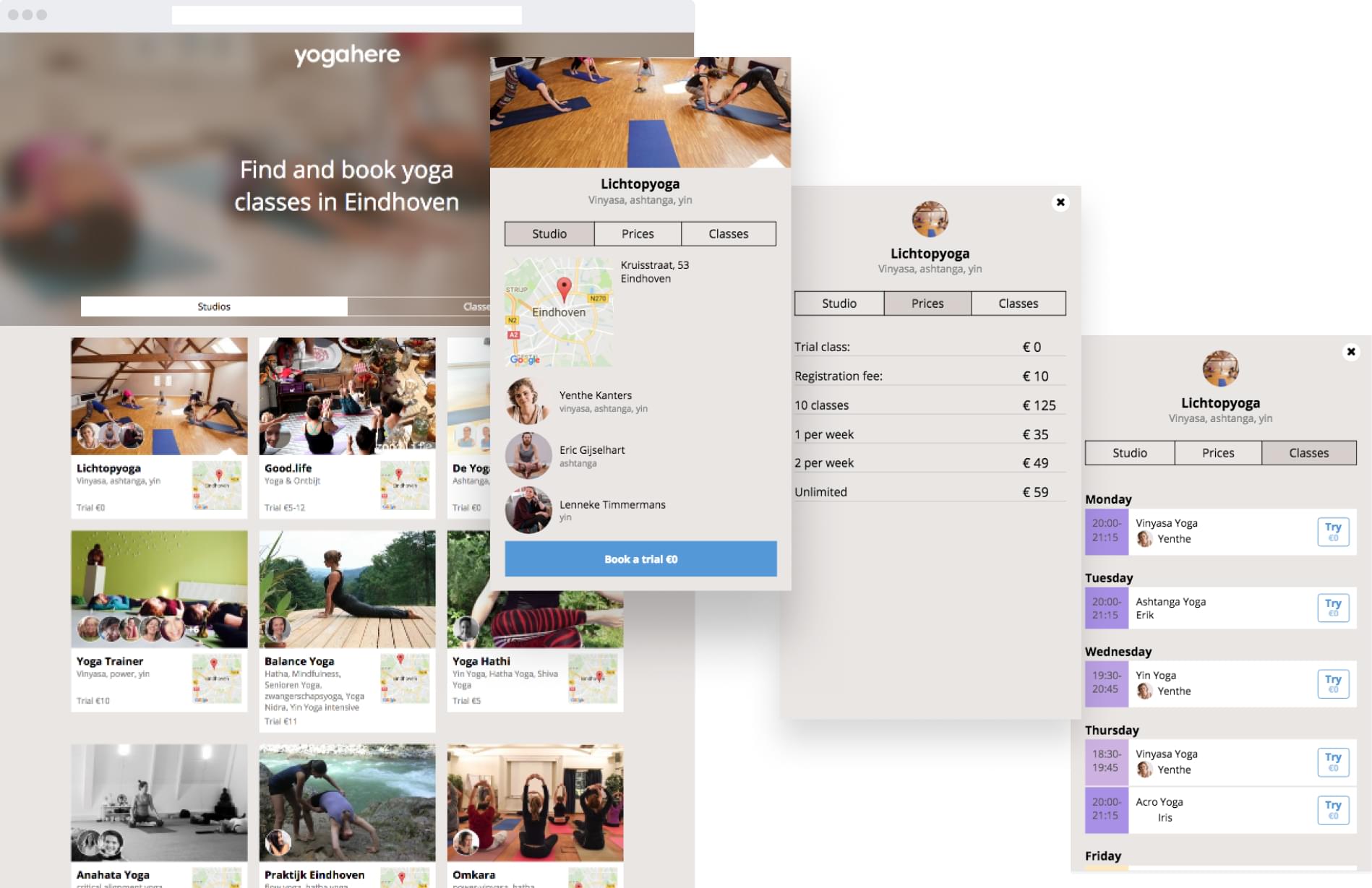 Yogahere is an aggregation of yoga studios in Eindhoven. We made it from personal pain of finding yoga classes.